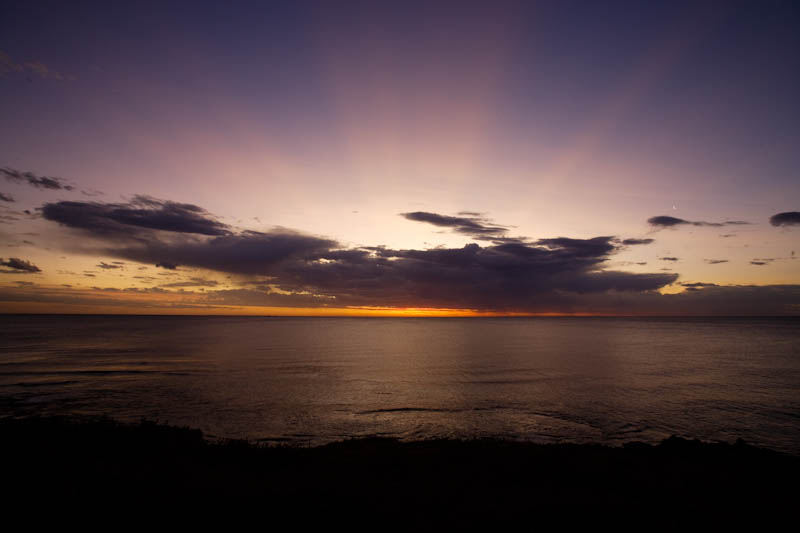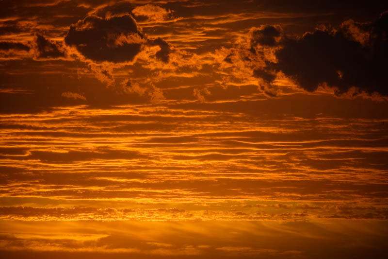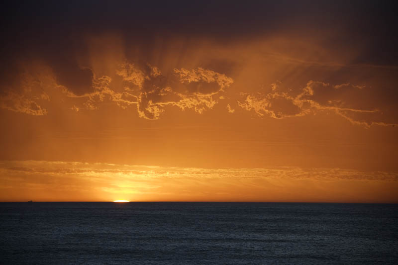 Layers of lit clouds linger over the setting sun. North Beach.